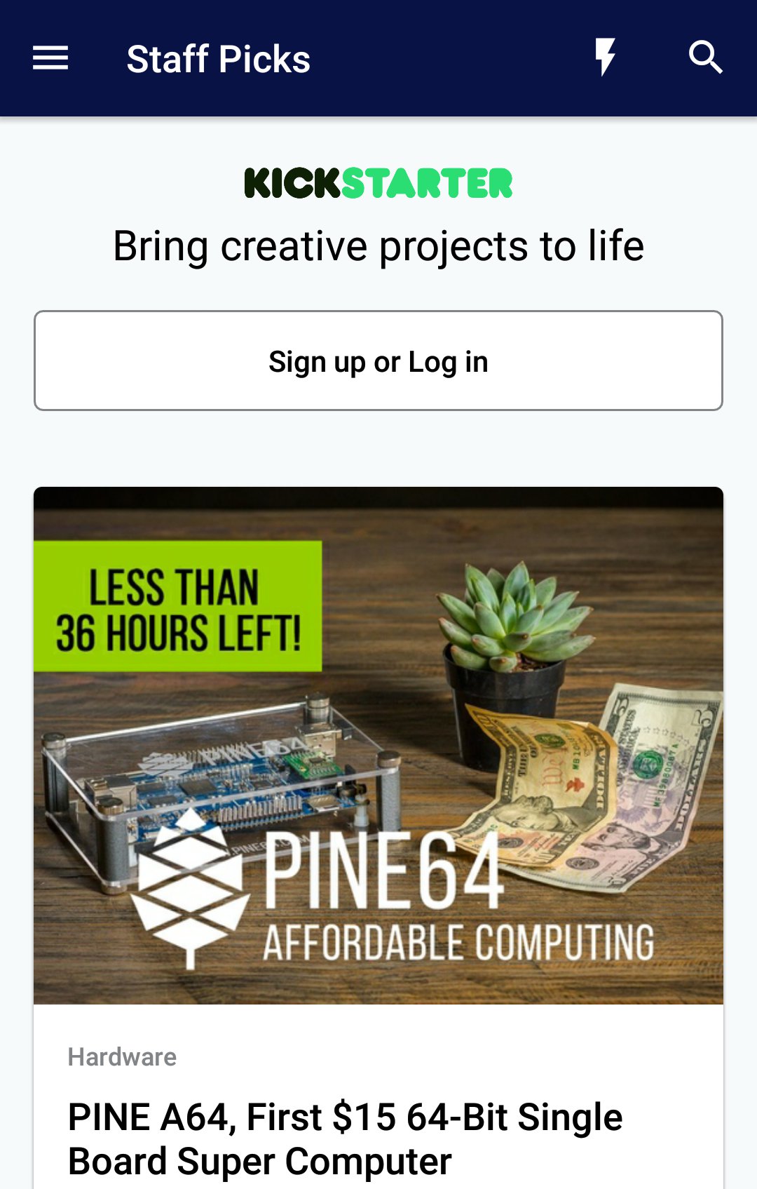 Pierwsze co rzuca się w oczy po instalacji aplikacji to jej prostota. Nie ma wodotrysków, a cały interfejs jest minimalistyczny i bardzo intuicyjny. Domyślnie na stronie głównej wyświetlają nam się projekty, które zostały wybrane przez pracowników Kickstartera. Tu mamy pewność, że na pewno znajdziemy coś oryginalnego.