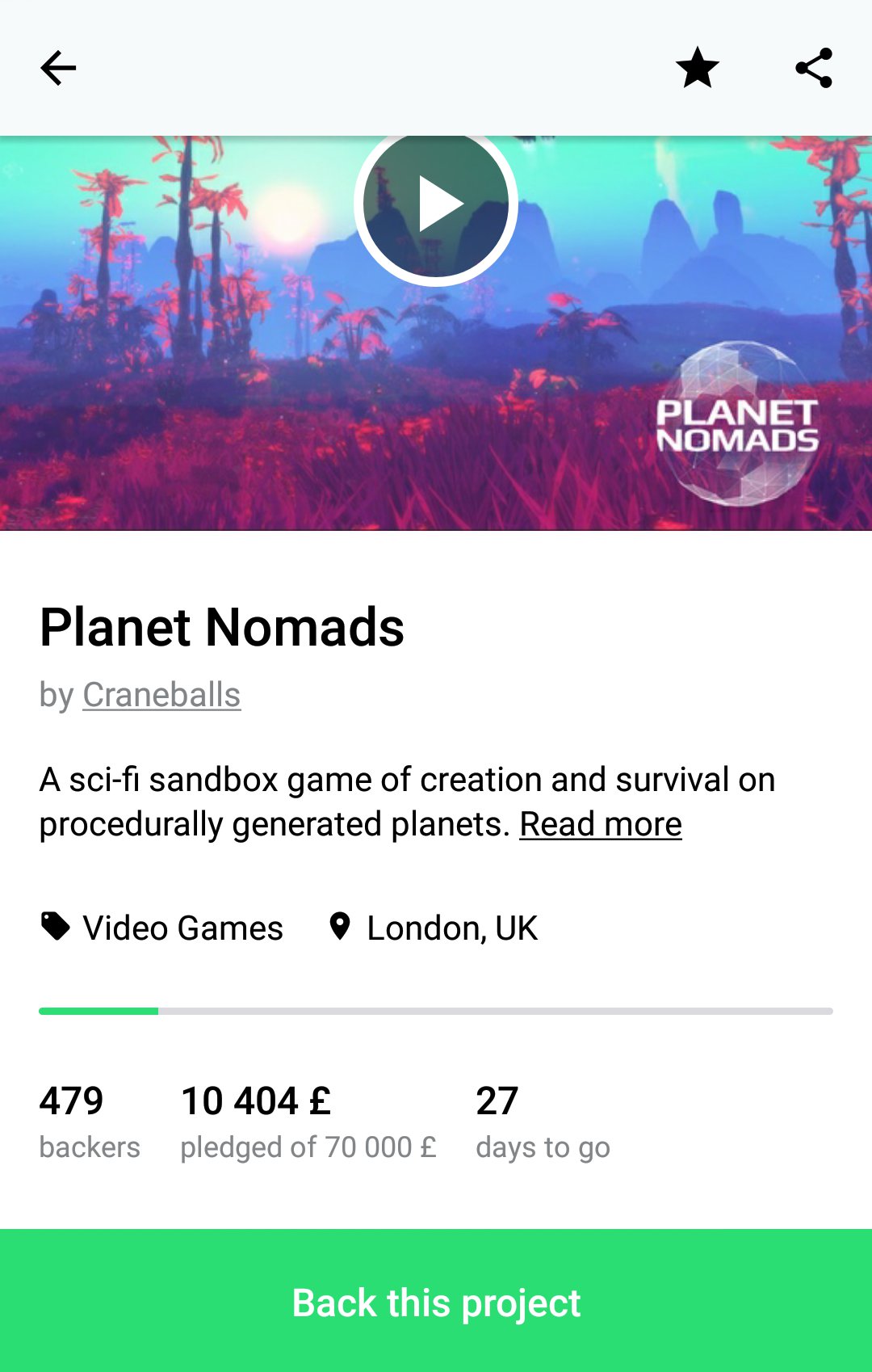 Po przejściu na stronę projektu, możemy obejrzeć dołączone do niego wideo oraz poznać wszystkie istotne informacje. Pod tym względem aplikacja nie ustępuje wcale „przeglądarkowej” wersji Kickstartera. Od pomocy twórcom dzieli nas już tylko kilka kliknięć.