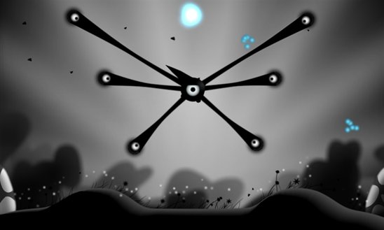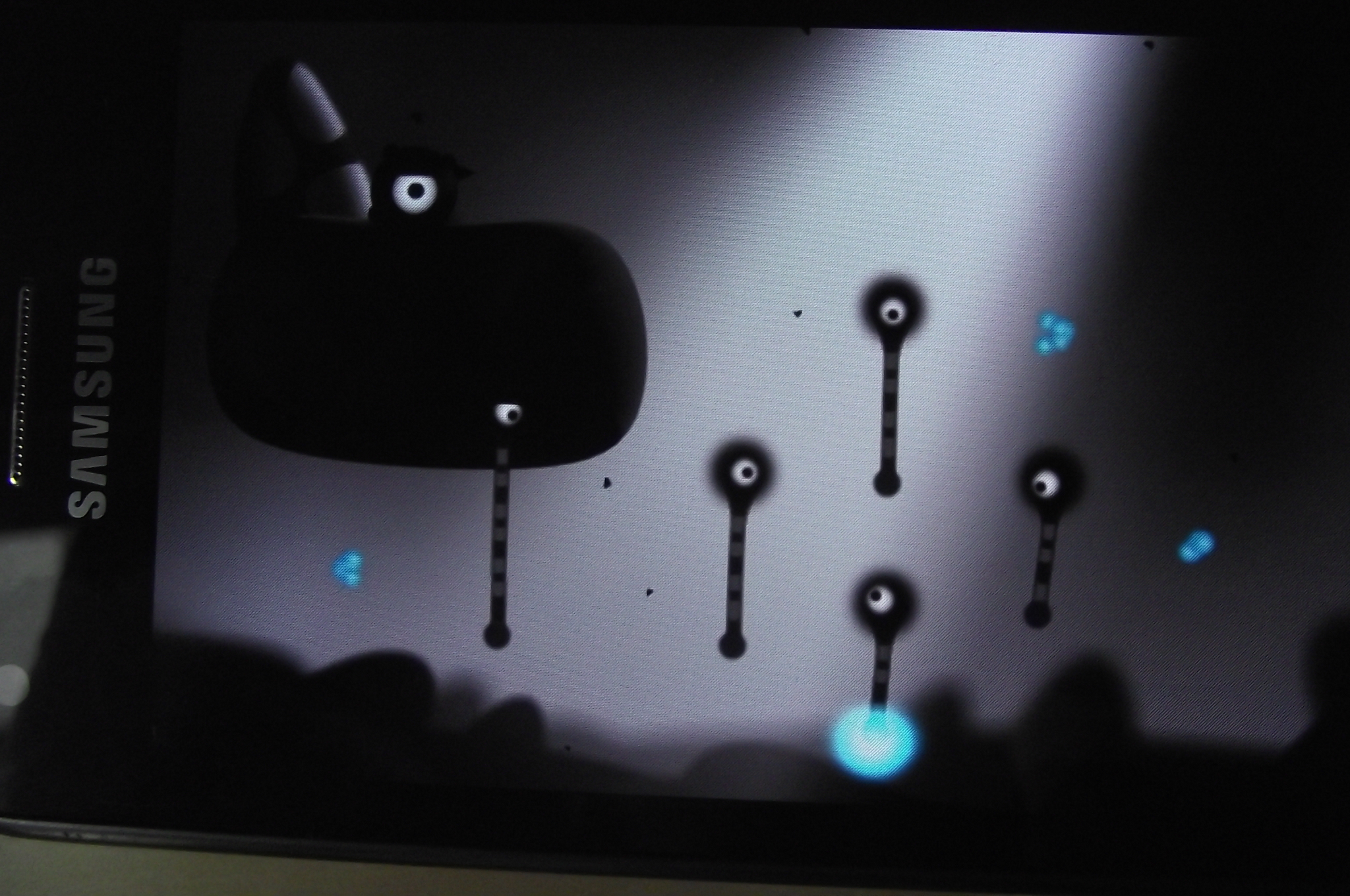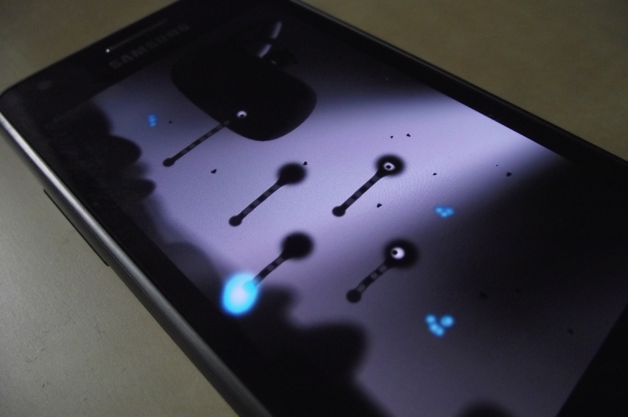 Rozgrywka jest bardzo mocną stroną tej produkcji i mimo tego, że nie jest taka jak w większości gier mobilnych to potrafi zainteresować na dłuższą chwilę. Cała gra idealnie uzupełnia się z muzyką i grafiką, o której napisałem więcej trochę niżej. Jak już wspominałem jesteśmy okiem i naszym zadaniem jest dostanie się do świecącego niebieskiego punktu. Po drodze dla większej ilości punktów musimy zbierać też mniejsze świecące kulki.