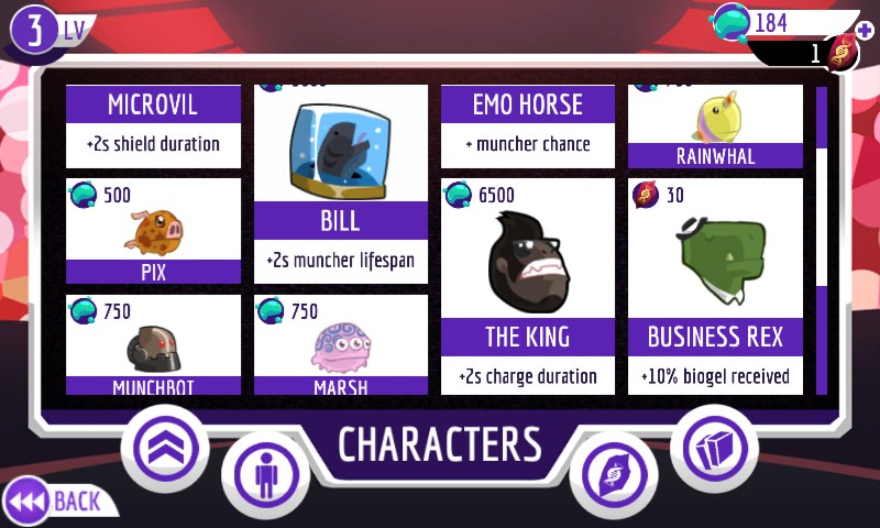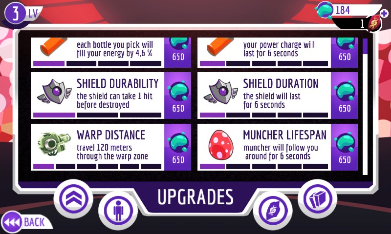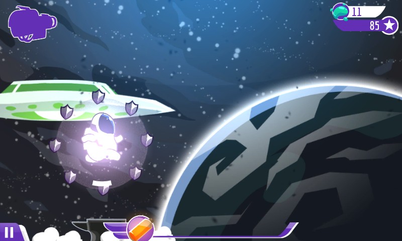 Jeśli uda nam się już trochę pograć i zbierzemy odpowiednią ilość „latających glutów” to możemy je wymienić na nowe postacie lub ulepszenia bonusów zbieranych na planszy. Na początku gramy człowiekiem, ale wybór jest spory i każdy znajdzie swoją ulubioną postać. Co ważne są one dość zabawne i możemy grać między innymi biznesowym T-Rexem czy Emo Koniem. Na początku dostępny jest tylko jeden świat (księżyc), a jeśli chcemy spróbować swoich sił w kolejnych dwóch to musimy niestety za to zapłacić. Na pewno ciekawym dodatkiem jest również możliwość podpięcia facebooka i sprawdzenia czy jesteśmy lepsi od naszych znajomych.