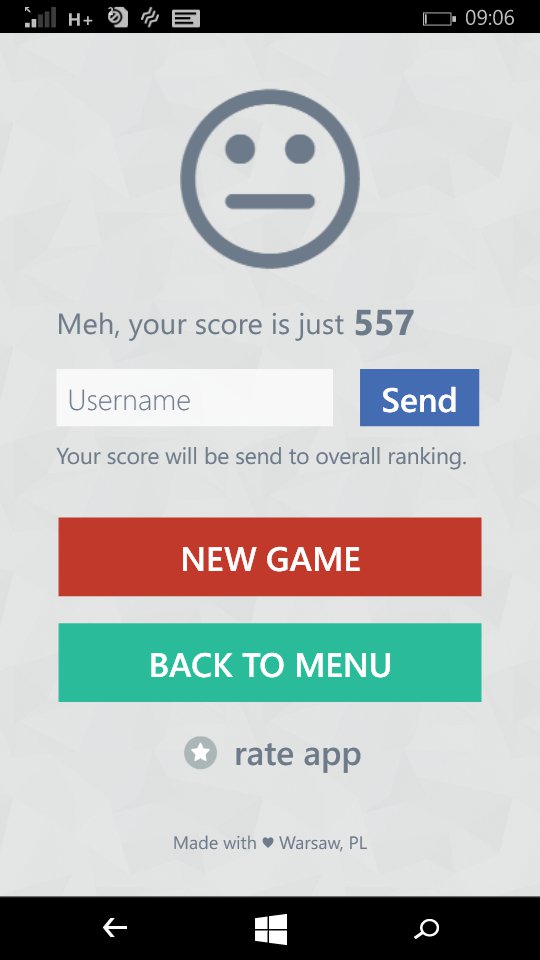 Rozgrywka jest szalenie prosta pod względem zasad, ale przy tym także całkiem wciągająca – rozegranie kilku szybkich partii pod rząd do standard, choć na dłuższą metę gra jest zdecydowanie bardziej monotonna. Mimo to koncept rozgrywki pozwala na intensywną i wymagającą zabawę podczas krótkich przerw czy podróży. Gra pod względem graficznym prezentuje się podobnie do innych produkcji tego typu, wspominając chociażby słynne już 2048 – dzięki temu gra uruchomi się praktycznie na każdym smartfonie z Windows Phone na pokładzie.