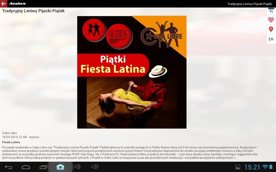 Na tym samym ekranie możemy wybrać kategorie trafiające w obręb naszym zainteresowań. Lista jest naprawdę długa, więc prawdopodobnie każdy znajdzie coś dla siebie. Są koncerty, gry barowe, sport, teatr i znacznie, znacznie więcej. Jeżeli pragniemy udać się na wystąpienie polityka aktualnie przebywającego w mieście to wystarczy dotknąć opuszkiem palca na specjalnie przygotowany wirtualny przycisk – program przedstawi krótki opis wydarzenia, datę, godzinę, lokalizację oraz zaprezentuje grafikę mającą coś wspólnego z całą akcją.