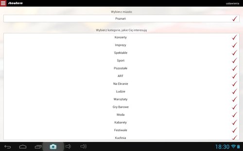 Tuż po uruchomieniu omawianej produkcji oczom naszym ukaże się menu główne, w którym należy ustawić własne preferencje, tak aby otrzymać satysfakcjonujące nas informacje. Na samej górze mamy możliwość wybrania miasta, co pozwala sądzić, że w przyszłości lista poszerzy się o kolejne metropolie – niestety skazani jesteśmy wyłącznie na Poznań, przez co dla osób zamieszkujących inne tereny Polski aplikacja Showhere jest bezużyteczna.