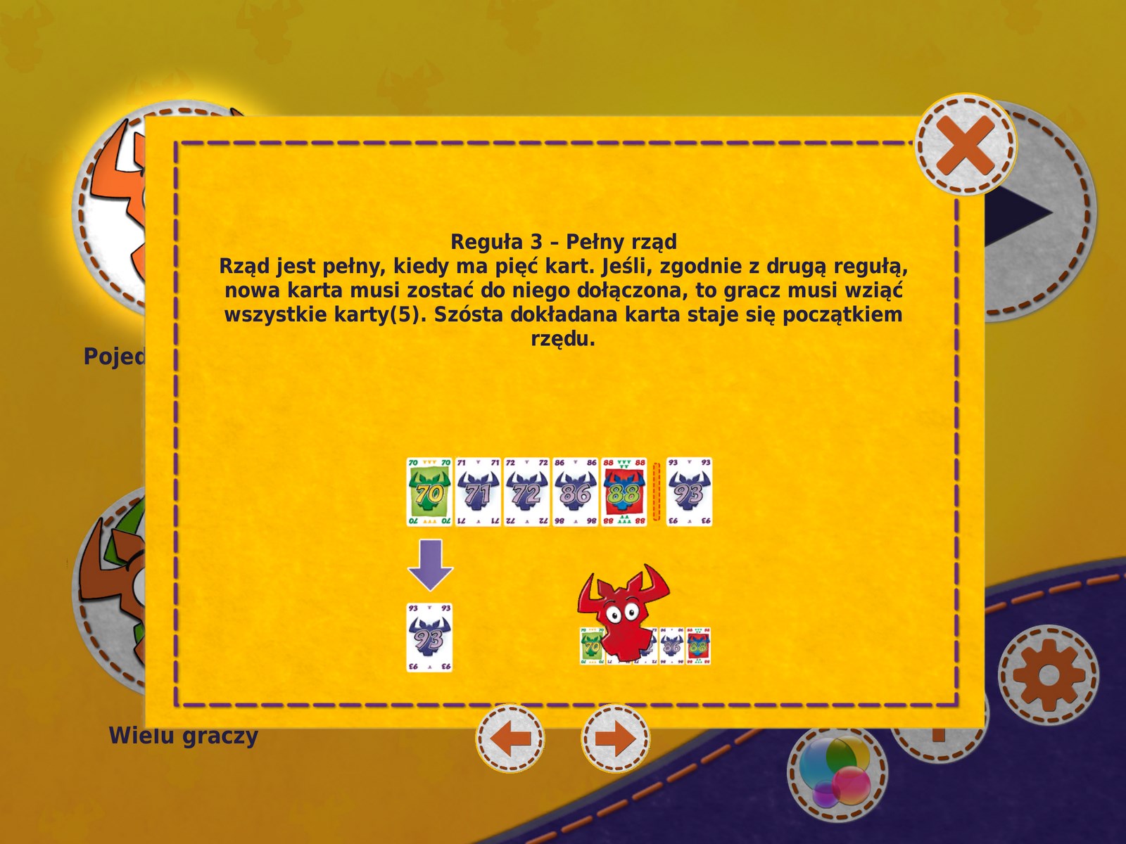 - jeżeli wykładamy kartę o niższym numerze niż leżące na stole, zebrać karty z jednego rzędu, a dokładana staje się pierwszą.
