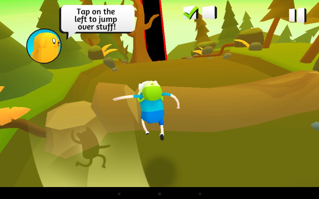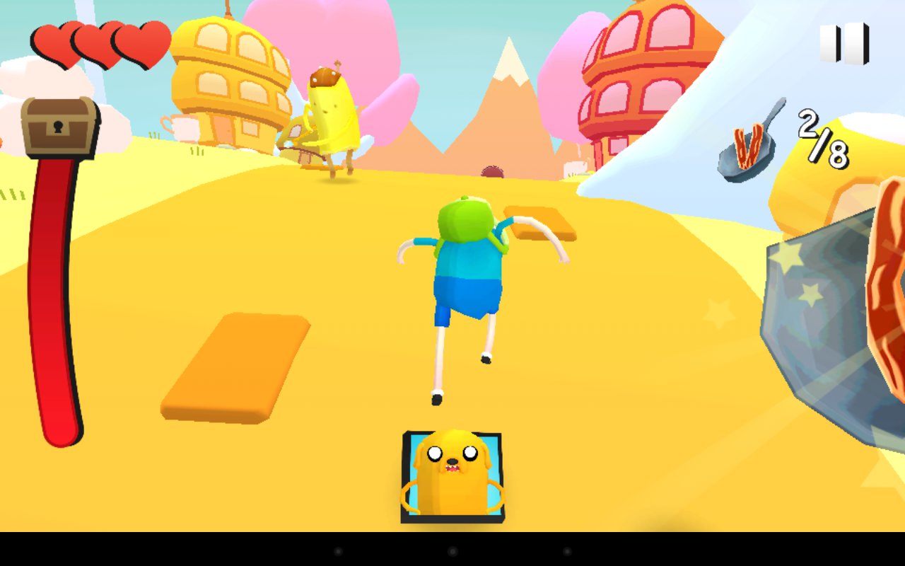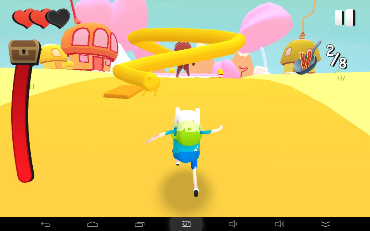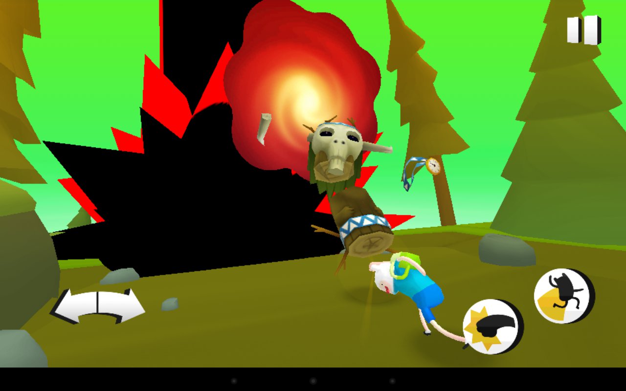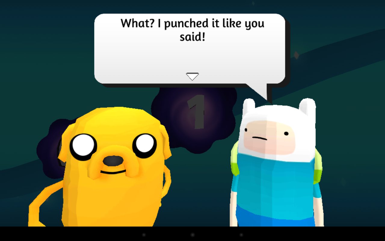 W Adventure Time działamy podobnie. Z przeciwka nadbiegają na nas przeciwnicy lub postaci neutralne – przeciwników omijamy lub walimy w nich pięściami, neutralni nie mają na nas większego wpływu – ale my na nich już tak. Profilaktycznie więc i im się dostaje, jeśli na nich wpadniemy.