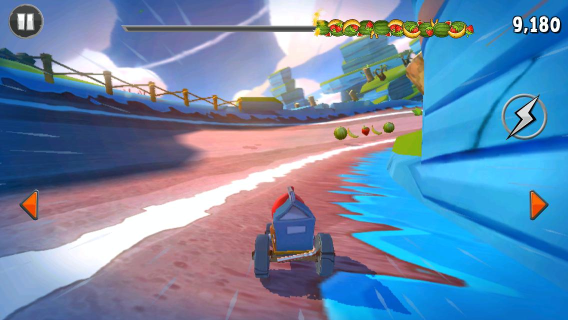 Zasady gry są oczywiste – zasiadamy za kółkiem pojazdu czterokołowego i poruszamy się nim na specjalnie przygotowanych trasach (jest ich wiele, ale nie są tak różnorodne jak moglibyśmy przypuszczać). Trybów rozgrywki jest kilka: począwszy od klasycznego wyścigu, poprzez pojedynki „jeden na jeden”, skończywszy na zbieraniu odpowiedniej ilości owoców podczas pojedynczego okrążenia. To oczywiście nie wszystko, ale nie mam zamiaru zdradzać kolejnych – przyjemność z odkrycia zostawiam Wam. Ilość pojazdów już tak nie zachwyca, ponieważ jest ich zaledwie siedem (w pierwszym „akcie”). Problem w tym, że wyłącznie trzy dostępne są do kupienia za pieniądze zdobywane w grze. Na kolejne cztery przyjdzie nam wyłożyć rzeczywistą walutę. Czterokołowce możemy modyfikować zwiększając ich statystyki w czterech kategoriach: prędkość maksymalna, siła, przyśpieszenie oraz sterowność.