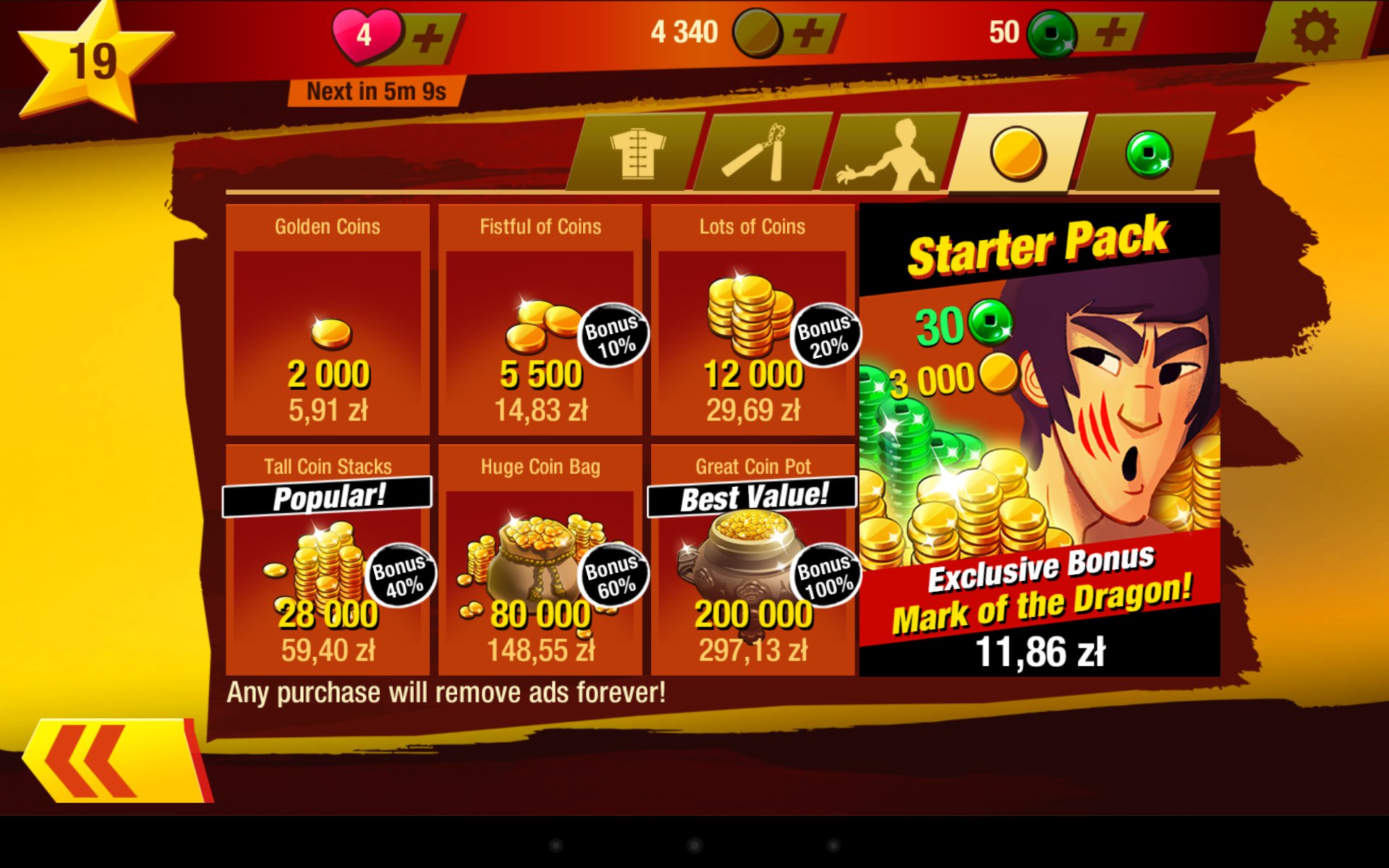Jeśli nie należymy do oszczędnych, to monety szybko mogą się skończyć. W takim wypadku jak zwykle przychodzą z pomocą uwielbiane przez wszystkich mikropłatności. Za 5,90 zł kupimy 2000 monet i jest to najtańszy zestaw. Ceny kolejnych można łatwo wyliczyć, bowiem kosztują zawsze dwa razy więcej, niż poprzedni – na niecałych 300 złotych kończąc.