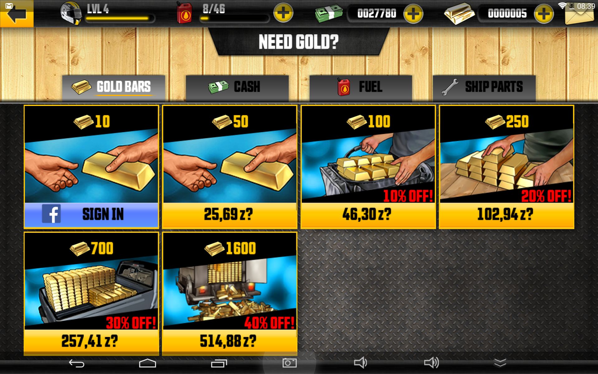 Podstawową walutą wykorzystywaną w trakcie rozgrywki są sztabki złota oraz pieniądze, ale ich wada – jak w codziennym życiu – jest jedna: prędzej czy później ich zapasy kiedyś się kończą. O ile w normalnym życiu co miesiąc przychodzi dzień, w którym te zapasy są uzupełniane, tak tutaj raczej nie możemy liczyć na to, że do naszej dyspozycji nagle trafią bonusy. Problem pojawia się także wówczas, gdy brakuje nam gotówki, gdyż tempo jej odnawiania jest zdecydowanie zbyt niskie. Na horyzoncie pojawia się również trzeci problem, którym jest paliwo potrzebne do wystartowania – jeśli zabraknie nam kilku kanistrów to, pardon, zostajemy w porcie. Ropę możemy kupić rzecz jasna za gotówkę lub złoto, a jeśli ich zabraknie to w każdej chwili możemy udać się do sklepiku wbudowanego w grę.