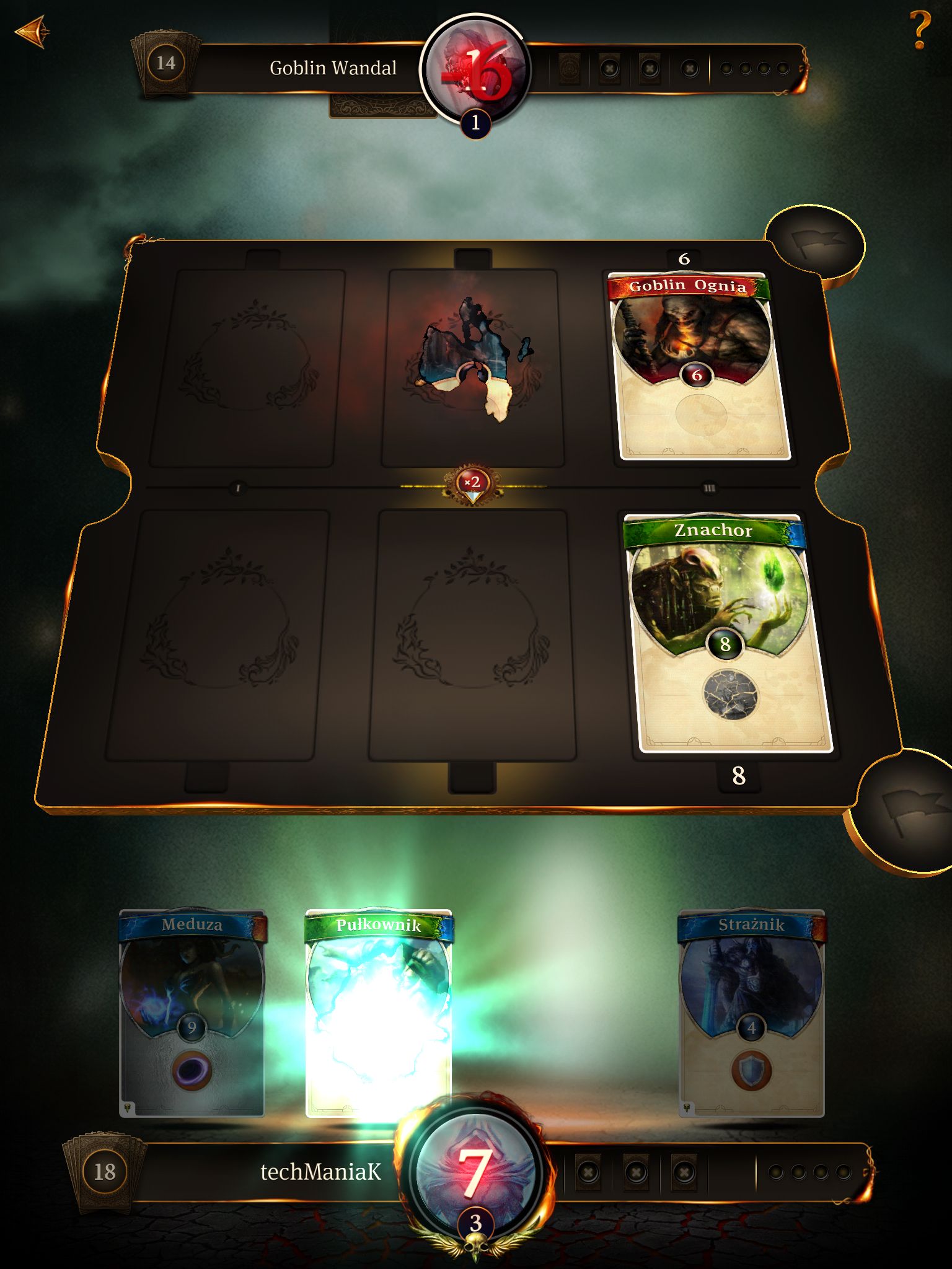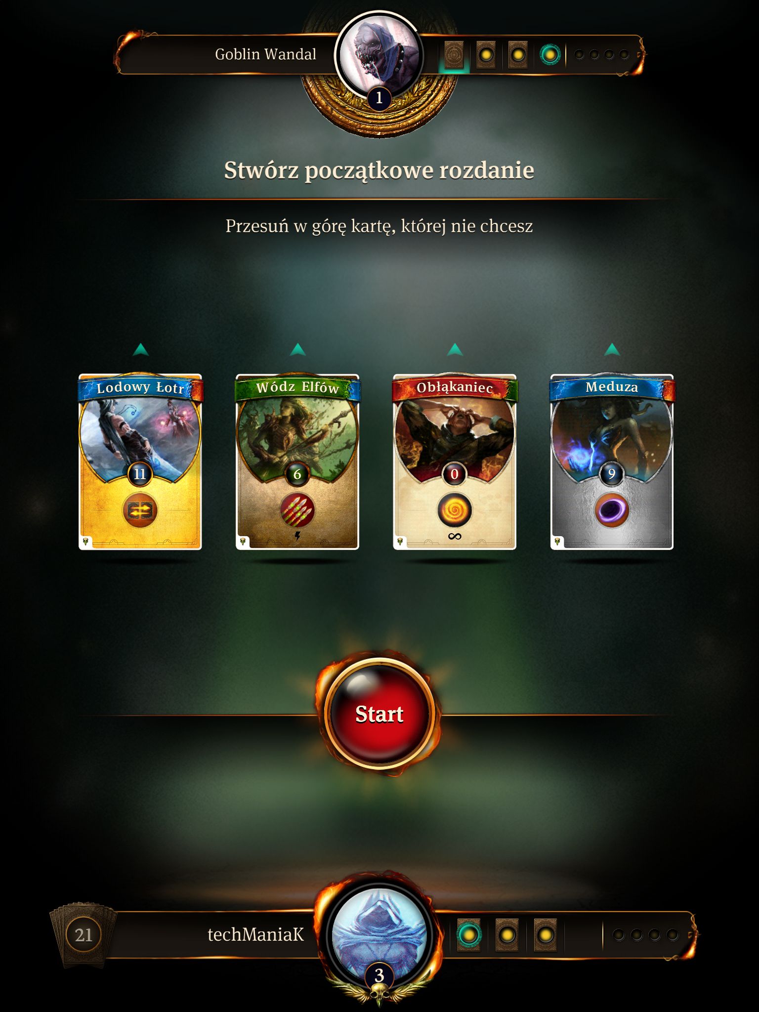Oto na planszy otrzymujemy miejsce dla sześciu kart – trzech naszych i trzech po stronie przeciwnika. Wyboru kart wystawianych do walki dokonujemy zaledwie z czterech propozycji – oznacza to, iż nasze pole manewru jest dość ograniczone. Karty, które trafią do naszej talii wybieramy jeszcze przed rozpoczęciem pojedynku – mamy jednak możliwość wskazania tylko jednej, nieodpowiadającej naszym oczekiwaniom pozycji, która zostanie losowo zamieniona na nową. Czasami możemy się na tym mocno „przejechać”, warto więc zawczasu pomyśleć, czy tego typu roszady na pewno są konieczne.
