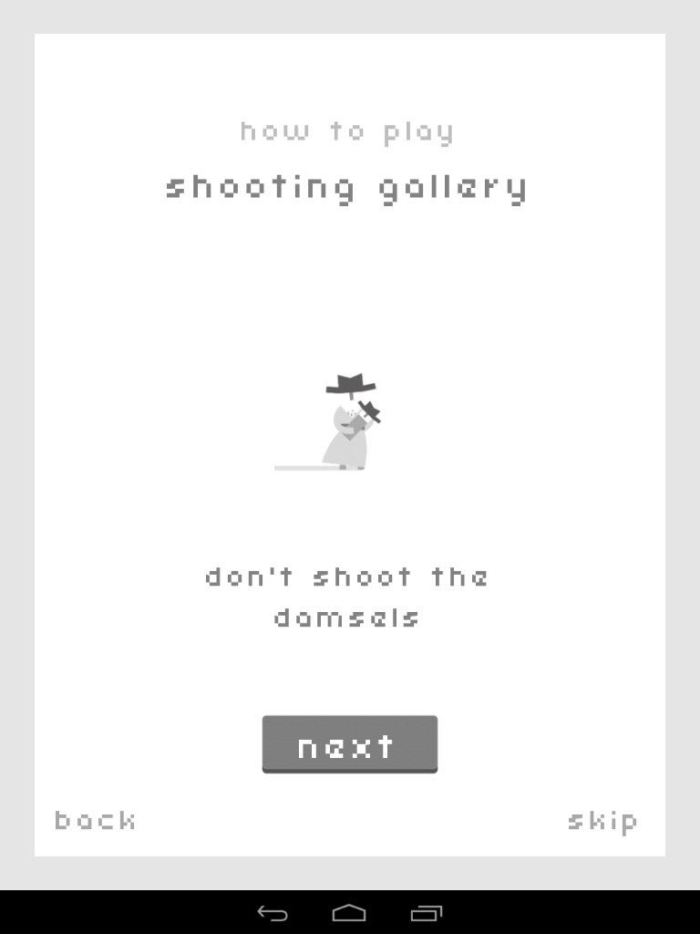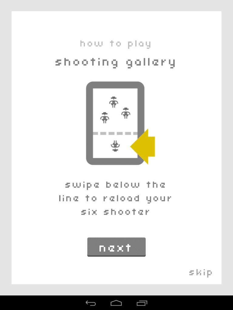Pierwszą z nich jest Shooting Gallery, czyli nic innego jak strzelnica. Ta nieco odbiega jednak od standardów, bo naszym celem są… inni kowboje. Pojawiają się oni w różnych miejscach planszy, a my musimy do nich strzelać, zanim oni strzelą do nas. Rewolwerowiec musi być szybki, ale ma tylko 6 strzałów. Trafiamy więc łańcuchy sześciu przeciwników, po czym przesuwamy palcem po dolnej części ekranu, by przeładować.