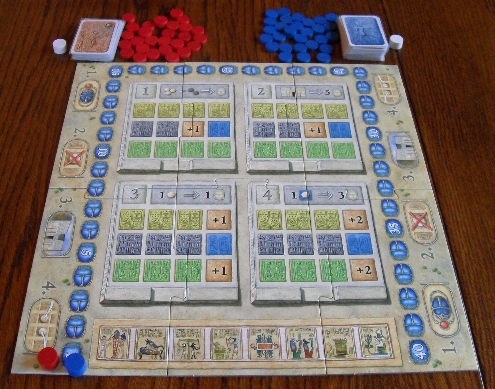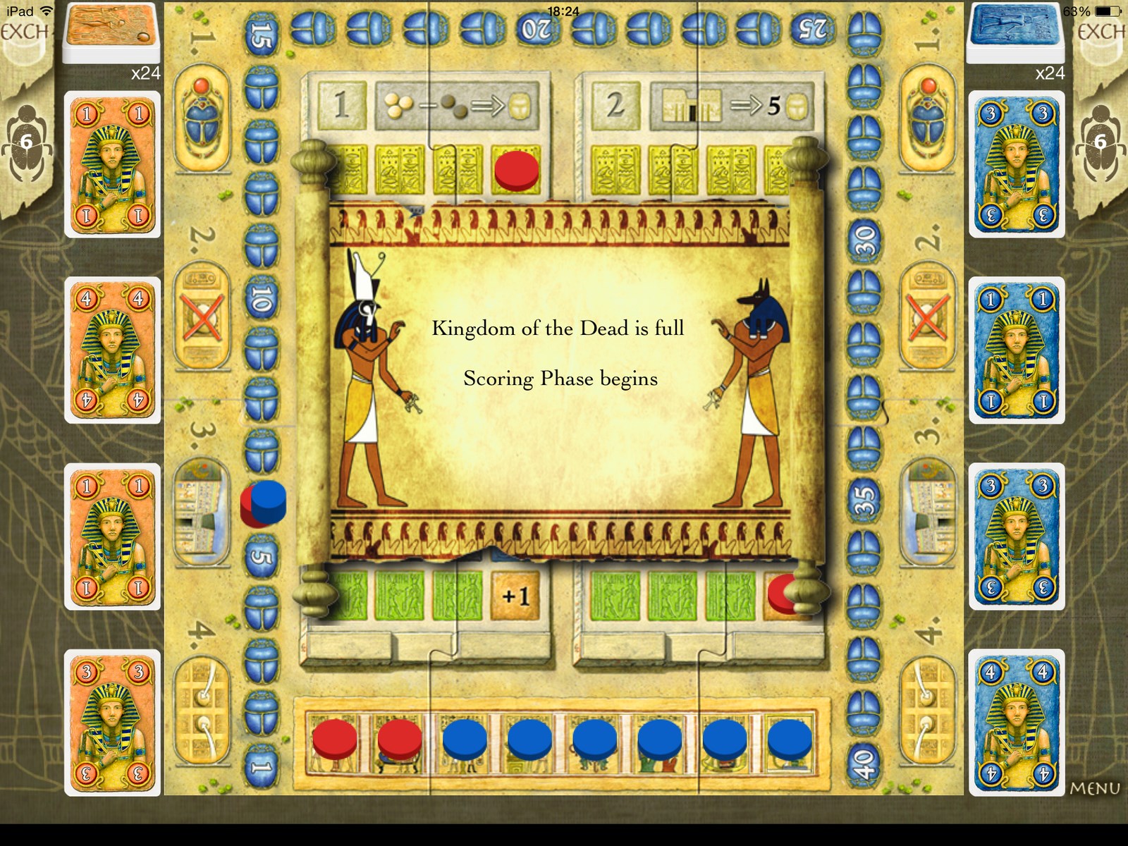 Kartusz pierwszy pozwala na otrzymanie punktów. Gracz z wyższą wartością otrzymuje podwojoną różnicę punktów. Kolejne kartusze określają kolejność gry, liczbę usuwanych lub dodawanych żetonów oraz świątynie w których możemy wykonać ruchy. Odrzucane żetony trafiają do królestwa śmierci. W momencie gdy zostanie ono zapełnione, następuje podliczanie punktów. Jeżeli żaden z graczy nie osiągnął jednego z warunków zwycięstwa, gra jest kontynuowana.