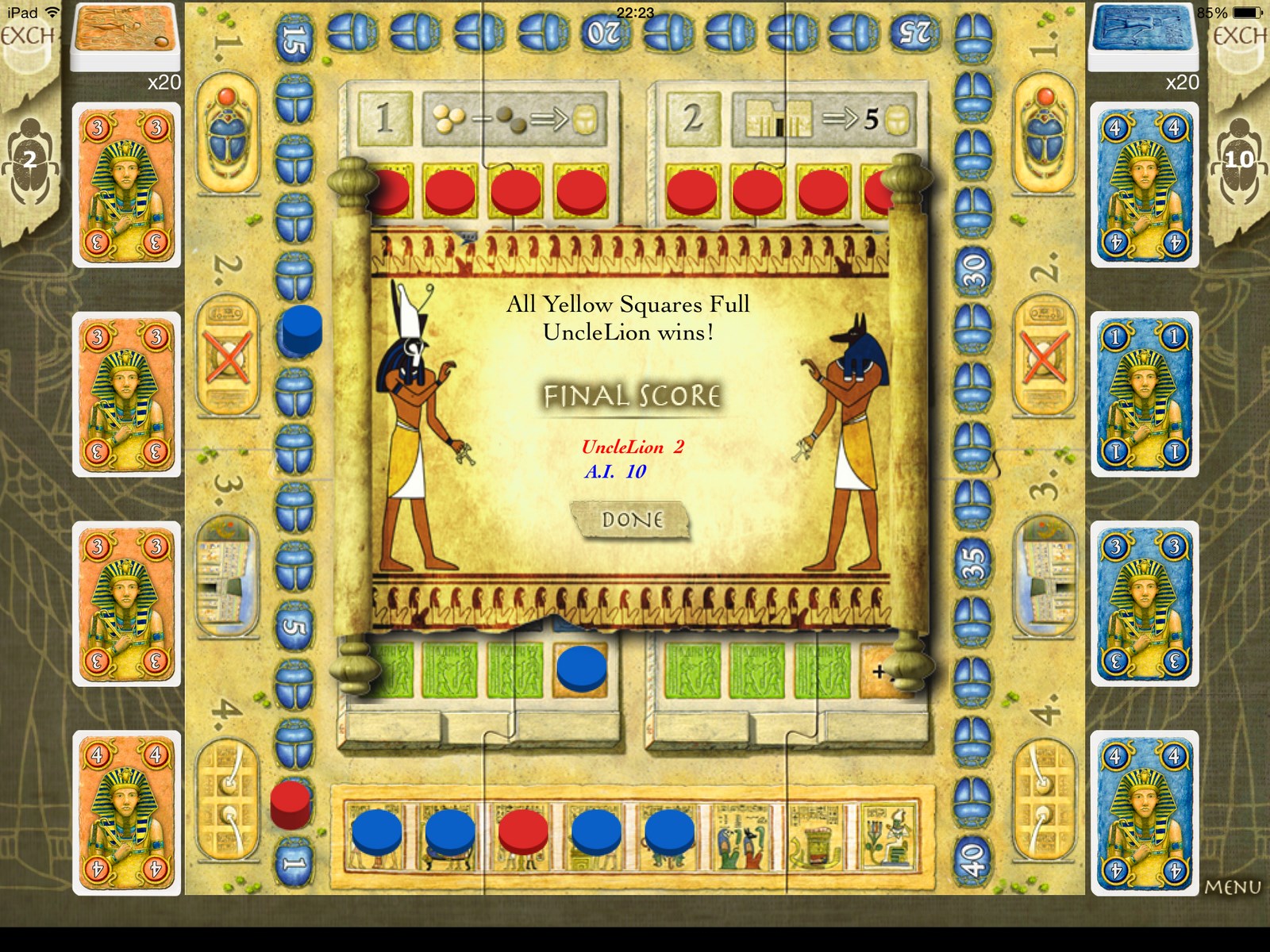 W cyfrowej wersji gry Thorstena Gimmlera, wykorzystano w całości grafiki z planszówki. Mamy zatem planszę, a na niej tor punktacji okalający cztery świątynie, kartusze i obszar królestwa śmierci, do którego trafiają zdjęte ze świątyń pionki. Każdy z graczy ma przypisaną identyczną talie z kartami o wartościach od 1-4. Są także żetony w dwóch kolorach.