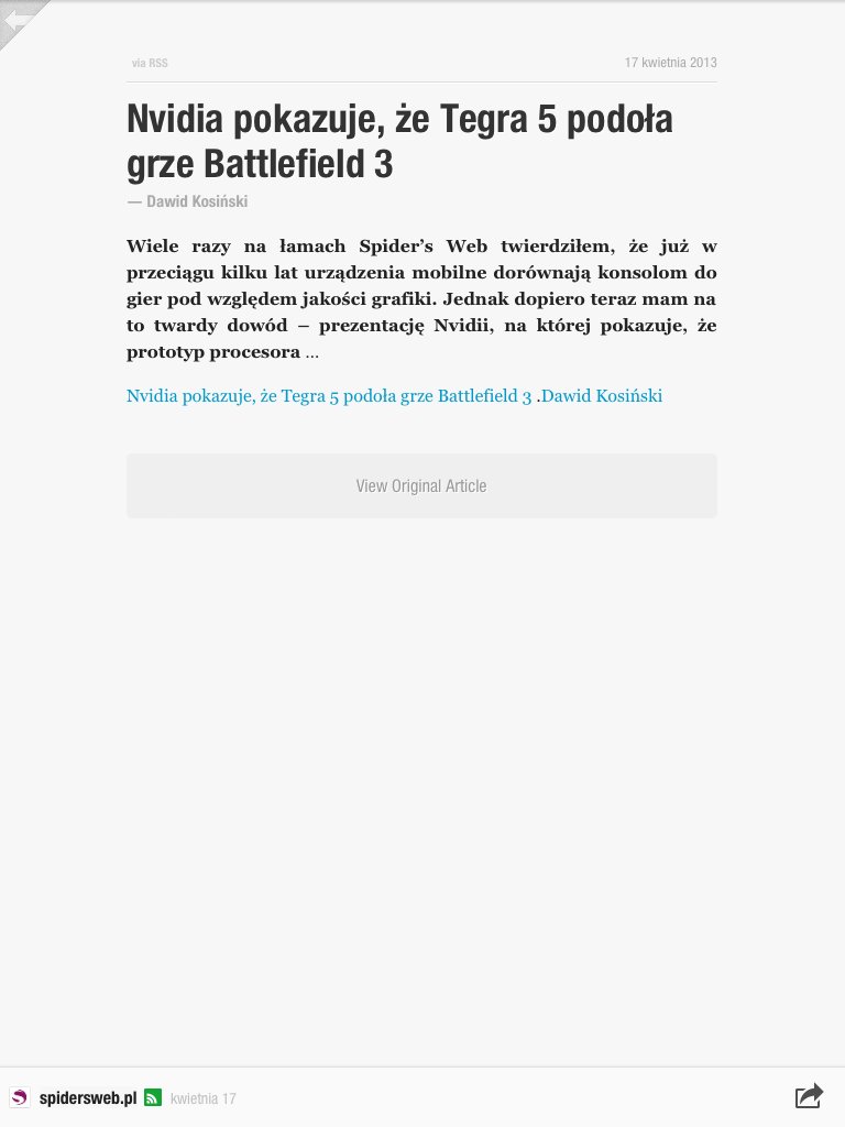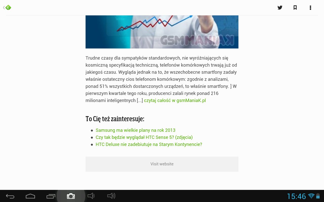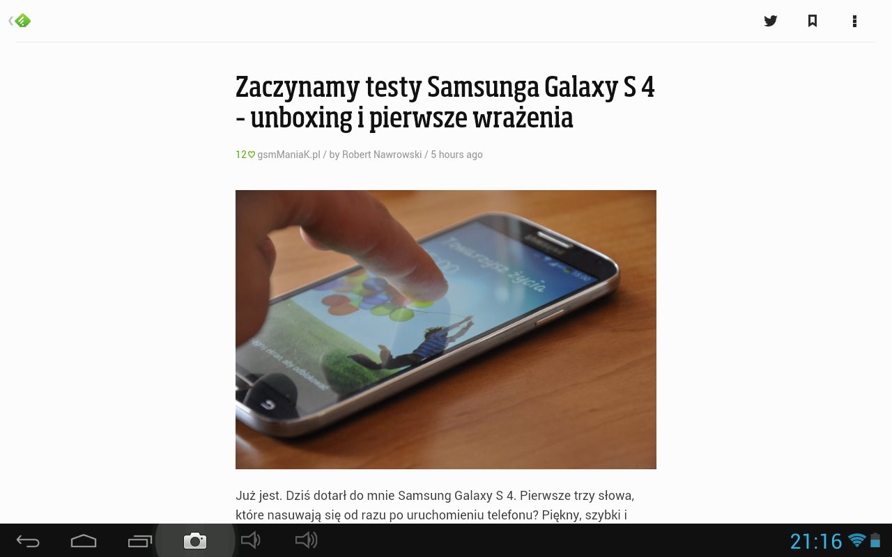 Kiedy zainteresuje nas konkretny news, wystarczy dotknąć nań opuszkiem palca. Wtedy oczom naszym ukaże się widok identyczny jak w magazynie Flipboard. Osoba niezaznajomiona z tematem mogłaby spokojnie pomylić te dwie aplikacje. Wystarczy popatrzeć na poniższe zrzuty ekranu – takie samo ułożenie tekstu i ewentualnie dostępnych grafik. Oczywistych podobieństw nie mogę jednak uznać za wadę – wręcz przeciwnie, jest to niezaprzeczalna zaleta.
