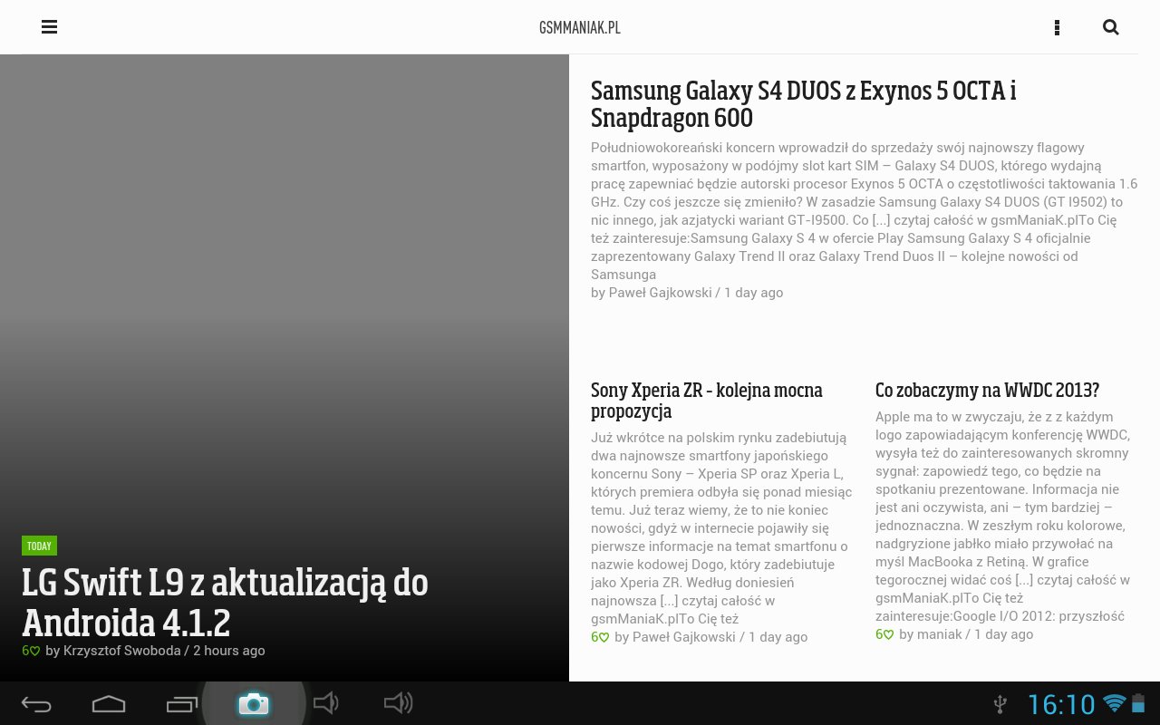 Ekran startowy przedstawia nam listę wszystkich materiałów tekstowych opublikowanych na witrynach internetowych przypisanych do naszego konta. Na pierwszej stronie zawsze wyświetlanych będzie osiem najnowszych – żeby przejść do kolejnych, należy wykonać ruch palcem po ekranie od dolnej krawędzi tabletu w górę. Animacja ta jest niezwykle płynna, dlatego nie musimy obawiać się żadnych, nawet najdelikatniejszych przycięć czy spowolnień.