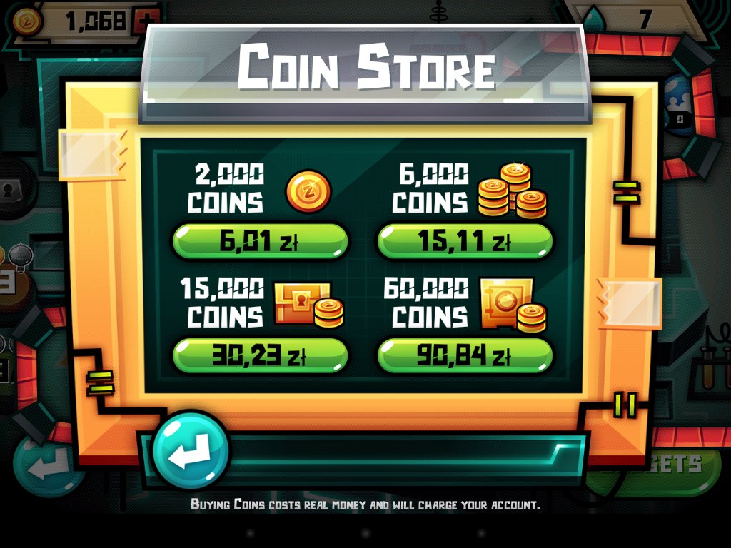 … mikropłatności. W grze możemy kupić sobie gadżety, tudzież power-upy, za walutę zdobywaną w grze. Te jednak kosztują tyle, że ograniczymy się raczej do małej liczby, a w dodatku na te najdroższe musimy trochę popracować. Zwolennicy szybkich rozwiązań oczywiście mogą rzucić się do sklepiku z monetami – tam widnieją cztery pakiety, w cenach 6 złotych za najtańszy i ponad 90 złotych za najdroższy pakiet 60 tysięcy monet.