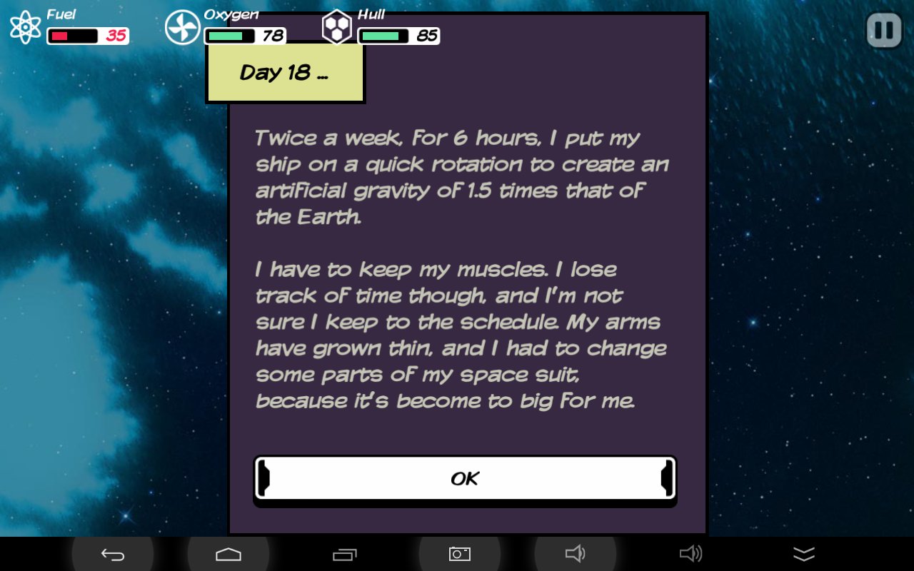 Co byście zrobili w sytuacji bohatera? Pierwsze co przychodzi na myśl – obieram właściwy kierunek i lecę. Zaraz, zaraz! Nie tak prędko! Wiemy, gdzie chcemy dolecieć jednak to nie takie proste kiedy jest się samemu w kosmosie. Silniki statku potrzebują przecież paliwa, człowiek potrzebuje tlenu, a do tego wszystkiego warto byłoby jeszcze kontrolować stan techniczny statku.