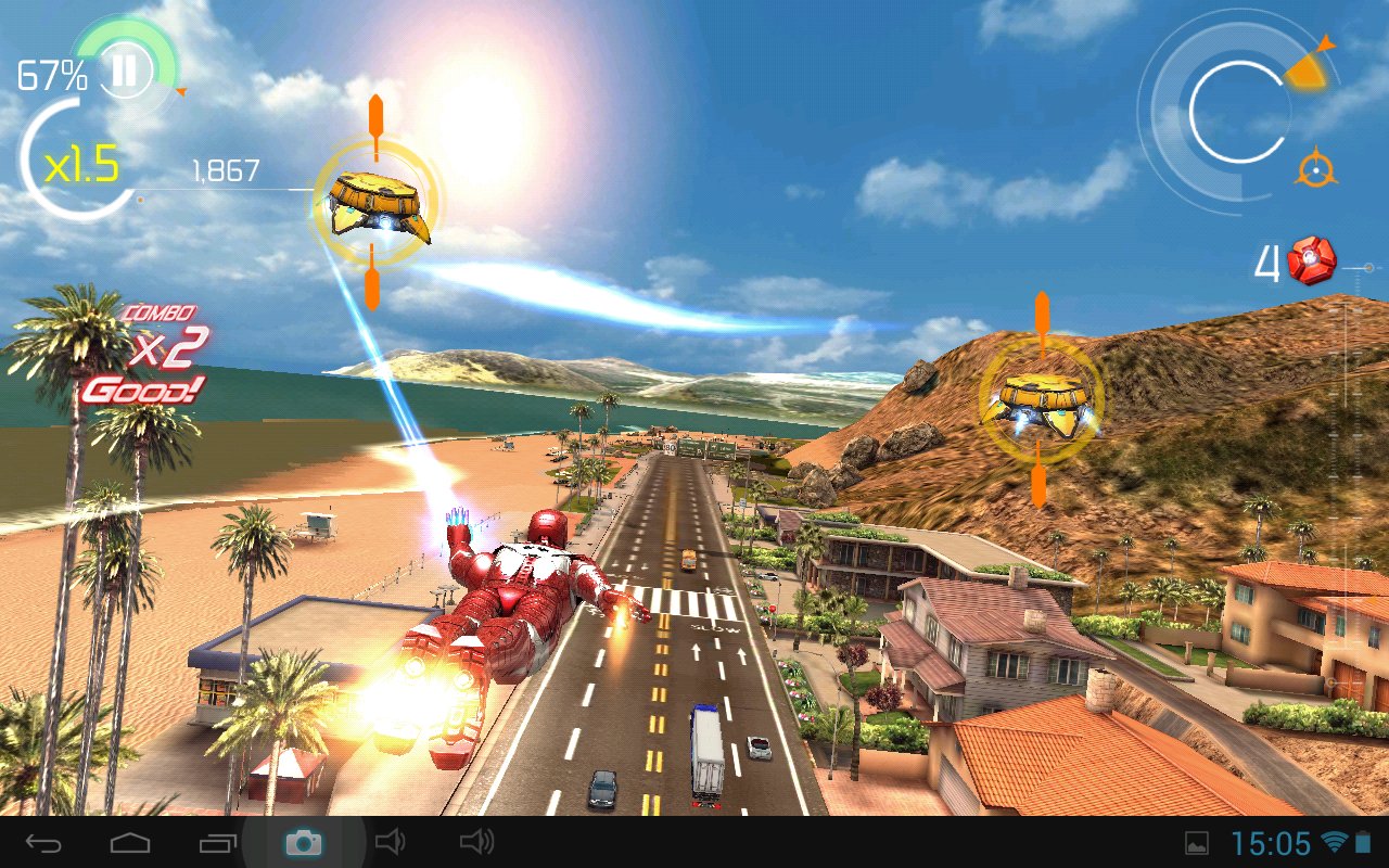 Jedynym skutecznym sposobem na pozbycie się oponentów jest ich destrukcja przy pomocy specjalnych działek zamontowanych w kombinezonie Tony’ego Starka. Aby z nich skorzystać wystarczy dotknąć opuszkiem palca na ekran urządzenia mobilnego – do miejsca, w którym skóra zetknie się z wyświetlaczem poleci pocisk. Taki system walki sprawdza się znakomicie, dlatego nawet wtedy kiedy jednocześnie pojedynkujemy się z wieloma przeciwnikami, batalie wyglądają niezwykle zjawiskowo i efektownie.