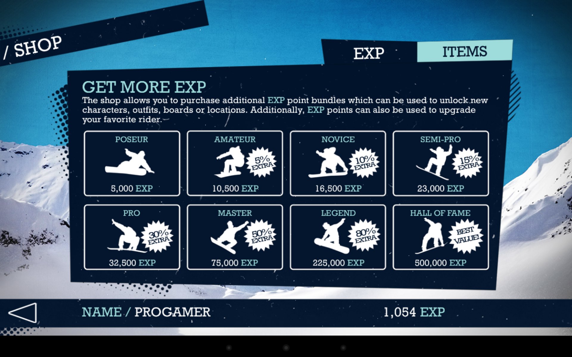 Tutaj jednak pojawia się pewien problem – otóż uzyskiwanie dostępu do kolejnych tras w grze wymaga dość sporej dozy cierpliwości i poświęcenia grze wielu godzin własnego czasu. Zgromadzony na trasie popularny „exp” wydajemy bowiem również na nowe elementy naszego ubioru, lepsze deski czy też rozwój poszczególnych cech wybranego skateboardzisty. Osoby z nieco mniejszą ilością dostępnego czasu raczej będą musiały się uciec do mikropłatności, co nie jest zbyt miłe, zwłaszcza iż stawki za poszczególne pakiety doświadczenia są nienajniższe. Pomocą w zebranie jak największej ilości doświadczenia mogą stać się różnorodne boostery, podwajające lub dające czterokrotną jego wartość, ale to nadal rozwiązanie, które jest dalekie od ideału.