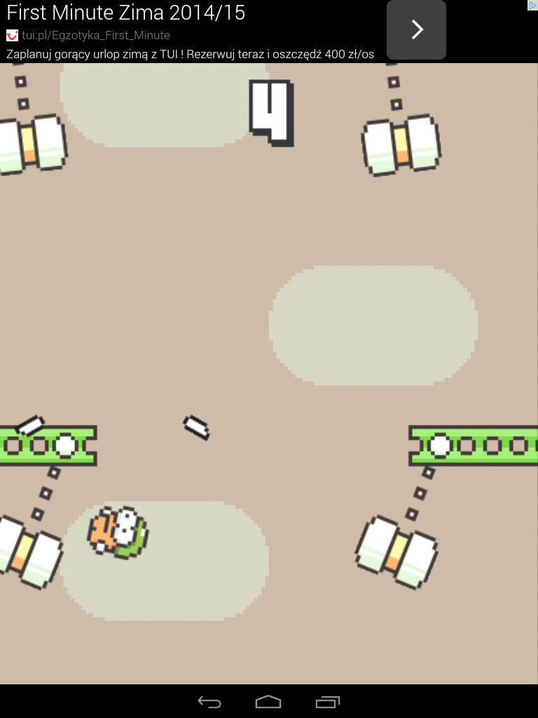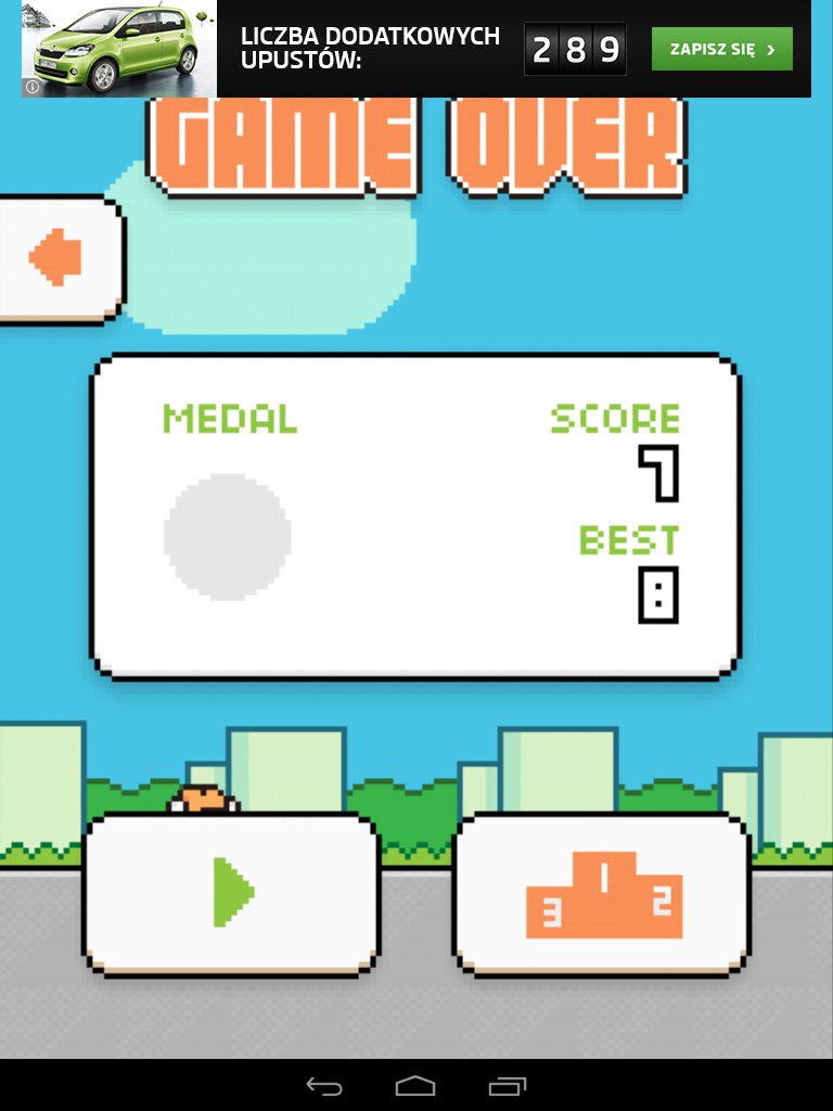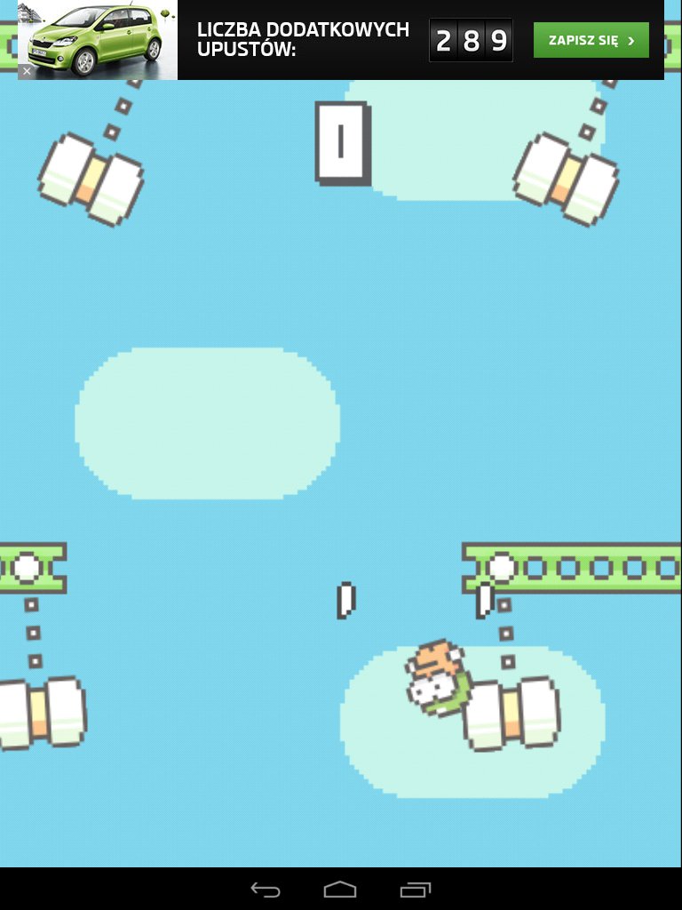 Mój rekord to 1, i musiałem odinstalować grę. Nie spodobał mi się ani ten flappy bird ani to.
