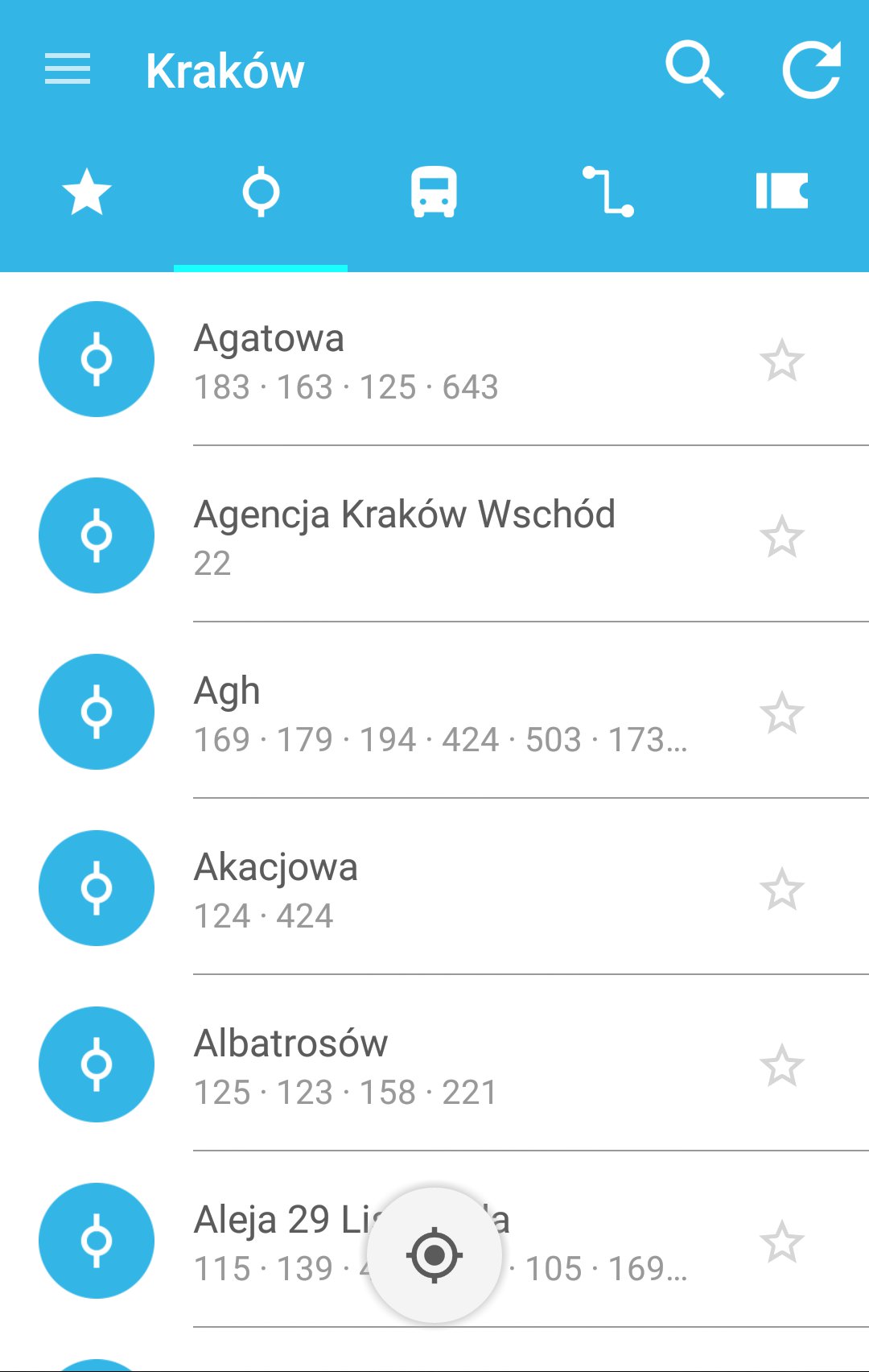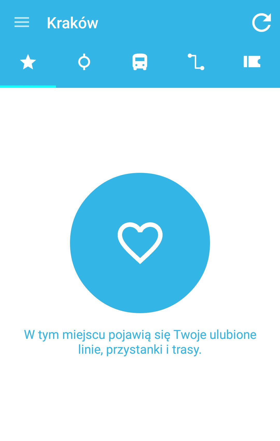 Po poprawnym pobraniu rozkładów naszym oczom ukazuje się główne menu aplikacji, które zostało zbudowane od podstaw zgodnie z uwielbianą przeze mnie filozofią Material Design. Ekran główny został podzielony na pięć dowolnie konfigurowalnych przez nas stron. Pierwsza z nich odpowiada za wyświetlanie ulubionych linii komunikacyjnych, tras oraz przystanków.