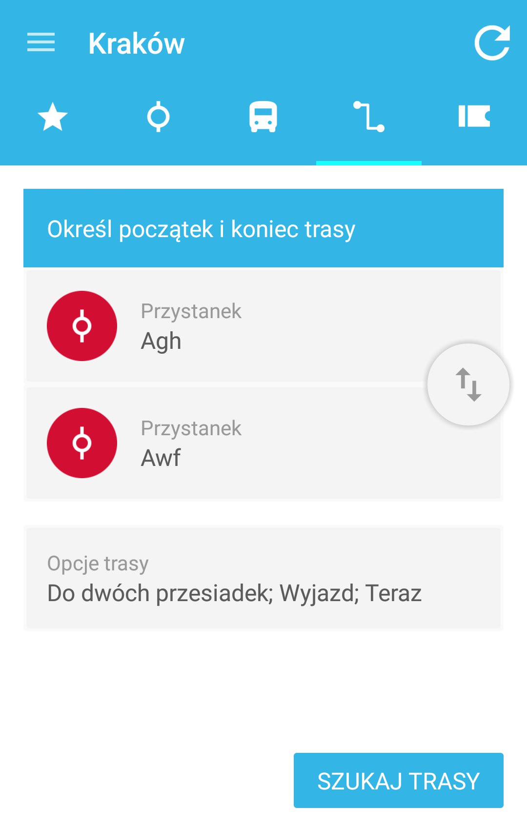 Przedostatnia z zakładek to coś, co lubię najbardziej – wyszukiwarka trasy. W tym miejscu wybierzemy przystanek początkowy oraz końcowy, a algorytmy Transportoida podpowiedzą nam optymalną i szybką trasę zgodnie z wybranymi opcjami.