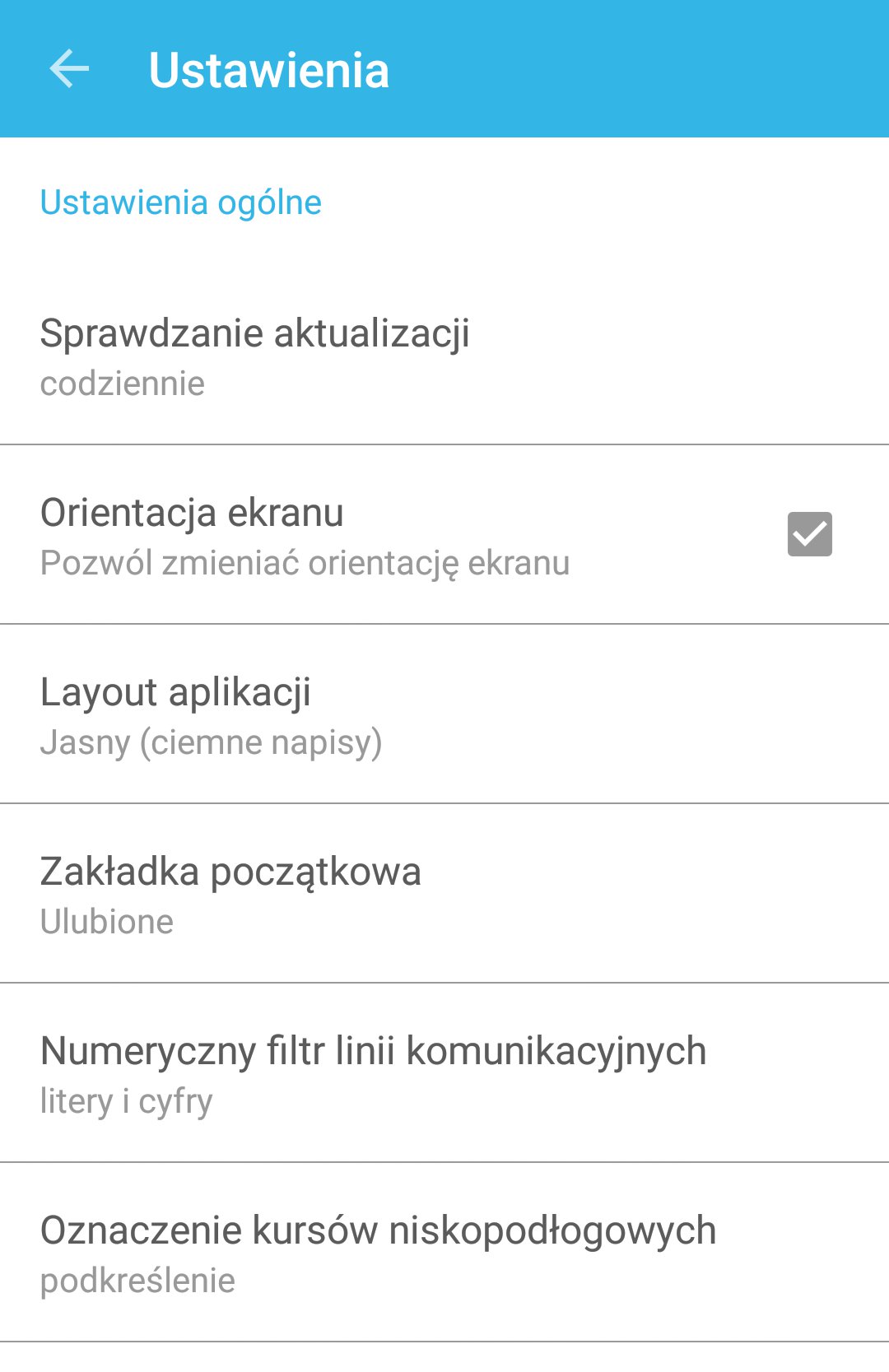 Przesuwając palcem w prawo otrzymamy dostęp do menu, które wysunie się z lewej strony ekranu. W tym przypadku od samego początku zainteresowała mnie zakładka Ustawienia oraz możliwości, które oferuje. Transportoid pozwala nam na ustalenie częstotliwości sprawdzania aktualnych rozkładów, zmiany orientacji ekranu, zmiany wyglądu aplikacji (!) oraz filtrowania wyników wyszukiwania na różne sposoby. Standardowo w tym miejscu zaznaczymy również ile potrzebujemy czasu na przesiadkę oraz ile metrów jesteśmy w stanie przejść w określonym czasie.