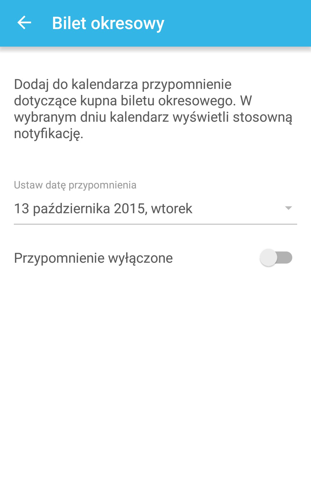 Jedną z funkcji, która od razu zwróciła moją uwagę po wysunięciu menu była zakładka Bilet Okresowy. Po wejściu w tę opcję okazało się, iż Transportoid umożliwia ustawienie indywidualnego przypomnienia dotyczącego kupna biletu okresowego. Aplikacja sama powiadomi nas o tym, że nasz bilet dobiega końca, przez co unikniemy nieprzyjemnej sytuacji w trakcie jazdy. Mógłbym powiedzieć: małe, a cieszy. Funkcja Biletu Okresowego to kolejna rzecz, przez którą Transportoid wygrywa z innymi aplikacji dostępnymi obecnie na rynku.